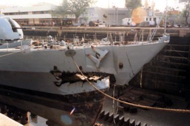 At the time of the incident, I was on watch in the Ship Control Centre as Engineering PO of the Watch. The Chief of the Watch was Pete Copestick. As the ship was involved in manoeuvres for most of the forenoon, I was kept busy constantly altering the control levers in response to orders from the Bridge, thus increasing or decreasing the speed of both engines. With Half Ahead rung on both telegraphs for the duration of the evolution, it was just a case of acknowledging each order and matching both levers with whatever order was passed down from the Bridge, then recording it in the Engine Order book. Pretty monotonous considering the amount of small variations in lever settings in response to the manoeuvring required to position the ship where it was supposed to be. Then out of nowhere, Full Astern was rung on both main telegraphs. I lined up the telegraphs and pulled both control levers back as far as they would go and waited for the propulsion control system to do its stuff, namely reduce engine power to zero, take all forward pitch off both propellers, apply full reverse pitch and then reapply engine power, all the way to full power. “Stand by for collision forward……” came over on the Main Broadcast as I wrote down the engine order in the book. Then came the actual collision, followed by the Deputy Marine Engineering Officer, Taff Strawford, who came running through the door with his roll of sellotape, which he used to seal over the last entry in the book. As “Hands to Emergency Stations” was piped, I was then relieved by the Action EPOOW, and took up my post at the Main Switchboard.