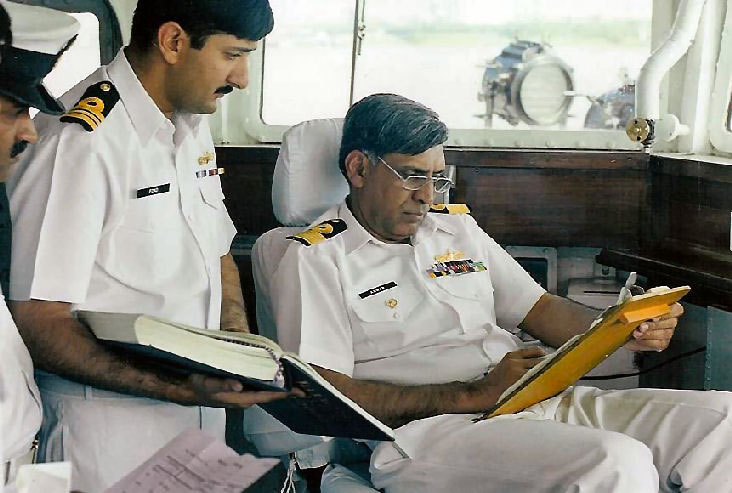 PNS Tariq Photographs As D-25 with Commodore's stripes on the bridge onboard the Flag ship Tariq : 1999 contributed by Commodore Muhammad Anwar Previous | Home | Next