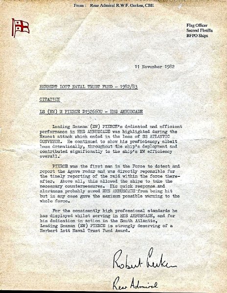 Falklands war citation for detecting Argentinean exocet missile which resulted in countermeasures which probably saved Ambuscade