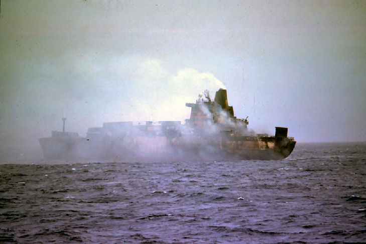 My Ambuscade Album Cdr PJ Mosse Atlantic Conveyor on fire after being hit by an Exocet after Ambuscade had evaded it by firing 4.5" and chaff rockets. photo ©Peter Mosse Previous | Home | Next