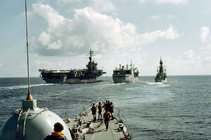 My Ambuscade Album Cdr PJ Mosse Indian Ocean rendezvous with USS America, supply ship Savannah, and USS Dale who we later collided with. 26th April 1983 photo ©Peter Mosse Previous | Home | Next
