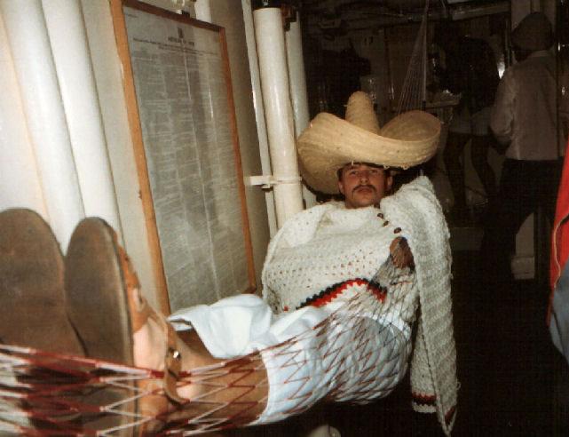 Another excuse to dress up: Ambuscade was a cruise liner in distress for a boarding excercise for HMS Birmingham who relieved us from West Indies Guard Ship January 1984 photo©Steve Griffin Download