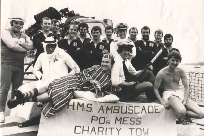 Guernsey (St Peter Port) 2-5th July 1979 Charity Tow Yeoman Creek, POMEM Spencer (Arab)MEA Heckley (sleeper), Mech Pickford (Hockey stick) & CEA Farmer (baby, photo supplied by Michael Gretton (Capt 1978-1980) Previous | Home | Next