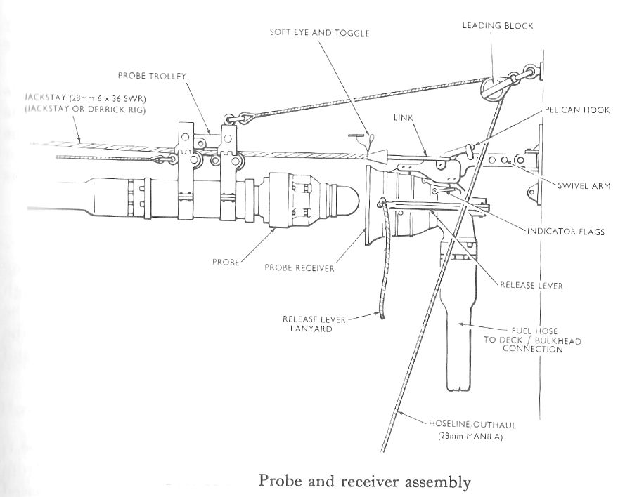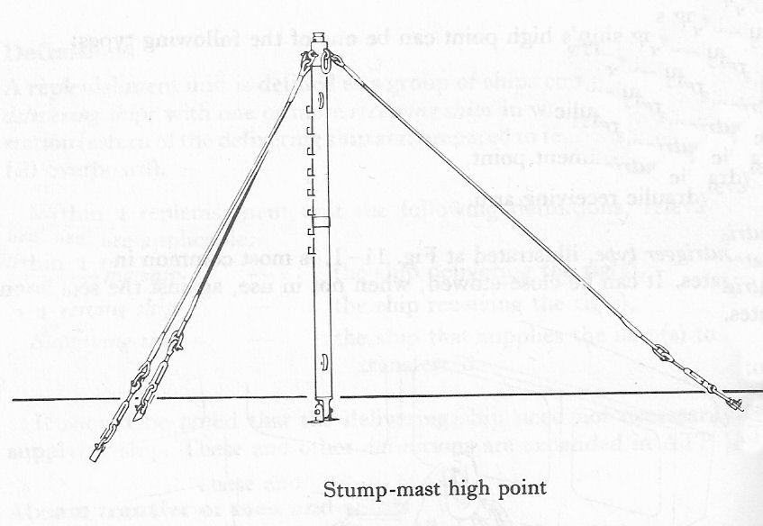 A Stump Mast was erected in the middle of the flight deck providing a high-point, the Rope (Jackstay) was tensioned and stores and ammunition was then transferred between the delivering and receiving ship.