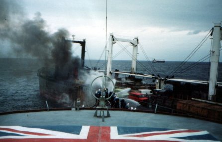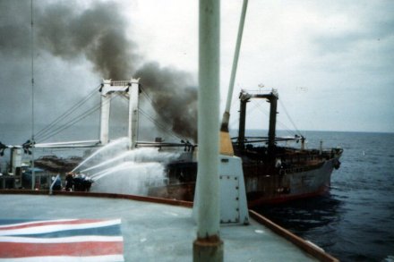 " My memories of this are that it occurred on a Sunday morning in February of 1982 as we were transiting north up the Red Sea heading home after our Armilla Patrol deployment. Myself and LS Ian Frame had the morning watch in the Ops Room when, at about 0500, we spotted a contact on the radar about 30 miles north of us. After reporting this to the Officer of the Watch we realised that the contact was not moving and that there was a second contact moving very slowly just to the north of it. I remember Ian and I having a small bet (more than likely a couple of cans) on what was going on as we continued to close on them. After a short time the bridge reported that they could see smoke on the bearing and it was not long after this that we realised the ship was on fire and so the fire fighting/damage control parties were called to close up. The second radar contact turned out to be a British tanker that had also stopped to offer assistance and I remember our boat crews racing them to the Aris so that we could claim salvage rights not realising that they had been there for some time! I think we spent about 24 hours helping to bring the fire under control using both fire parties onboard as well as boundary cooling from the forecastle as can be seen in the photographs. I also remember that we were under pressure to get under way again as we had been allocated a convoy position for our transit of the Suez Canal and so we had to be at Port Suez by a given time otherwise we would miss it. As I recall a sea going tug came out and took Aris under tow and beached her somewhere so the fire could finally be put out but I’m not sure about this. I do know that several years later we all got a pay out from the salvage which was very nice"
